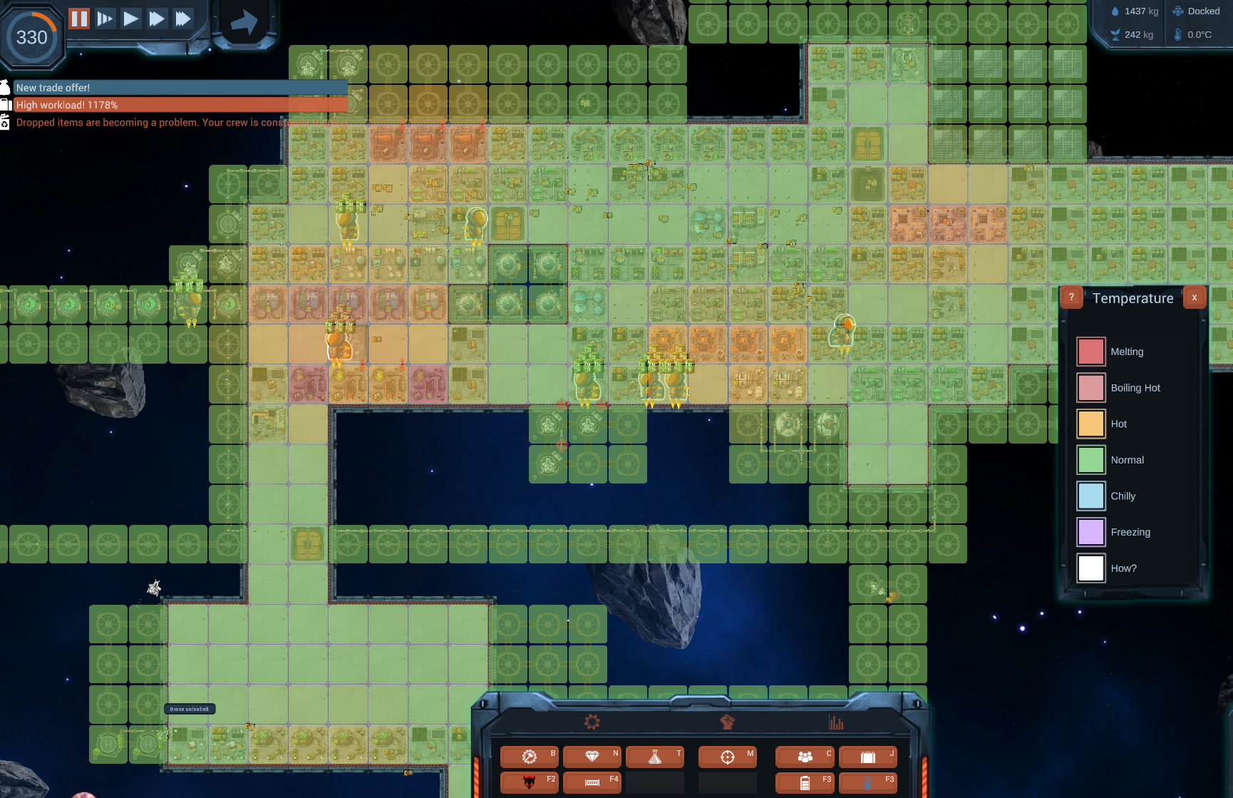 Redone temperature system Instead of the station having a single temperature, each grid cell will have its own, thus allowing for hotspots to appear in mid to late game. This will make overheating devices more common. Some devices/interactions might be added during beta, like ice melting in hot rooms cooling it a bit down, or crew sweating/shivering giving them debuffs.