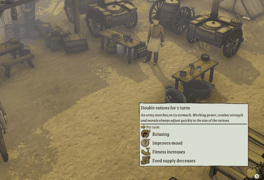 We have made a change to the supply UI. Rations are now displayed as a separate attribute with a numerical display indicating how many turns the selected ration will last. This replaces the previous supply attribute. The number of available grenades is now also displayed as a number rather than a level symbol.