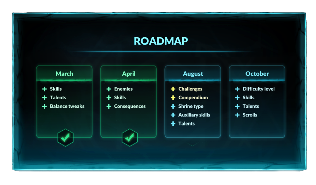 Greetings, gods! I've made a few updates to the roadmap. The biggest change: the June update has been pushed back to August. This is due to some personal matters and a heavy workload on another project.