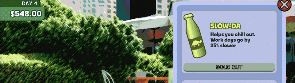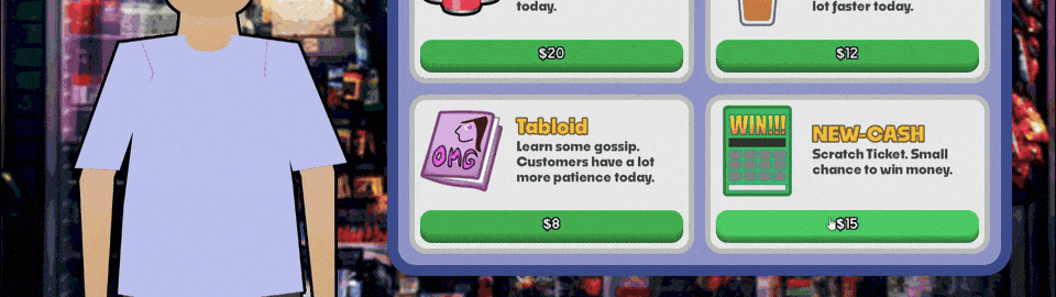 The Bodega has 4 slots of rotating items, all of which can modify your work day. Squirt sauces faster, increase customer patience, and earn more money! It's the perfect way to start the morning before doggin. Plus, the shopkeeper might have some interesting things to say.