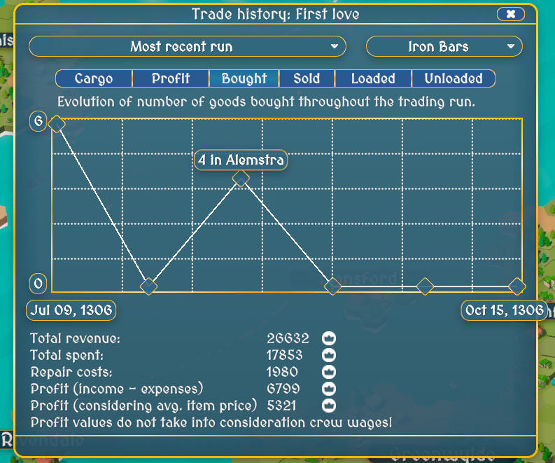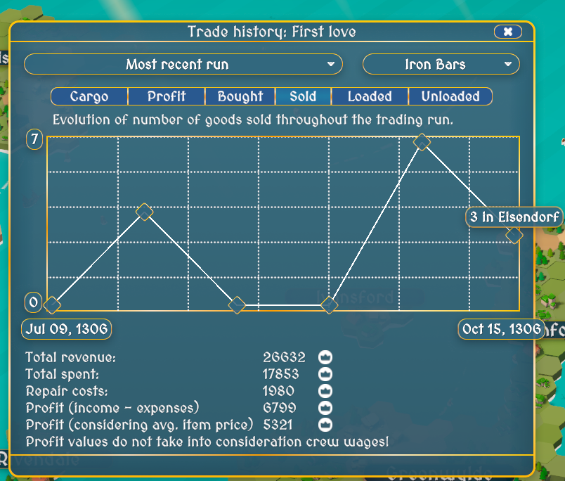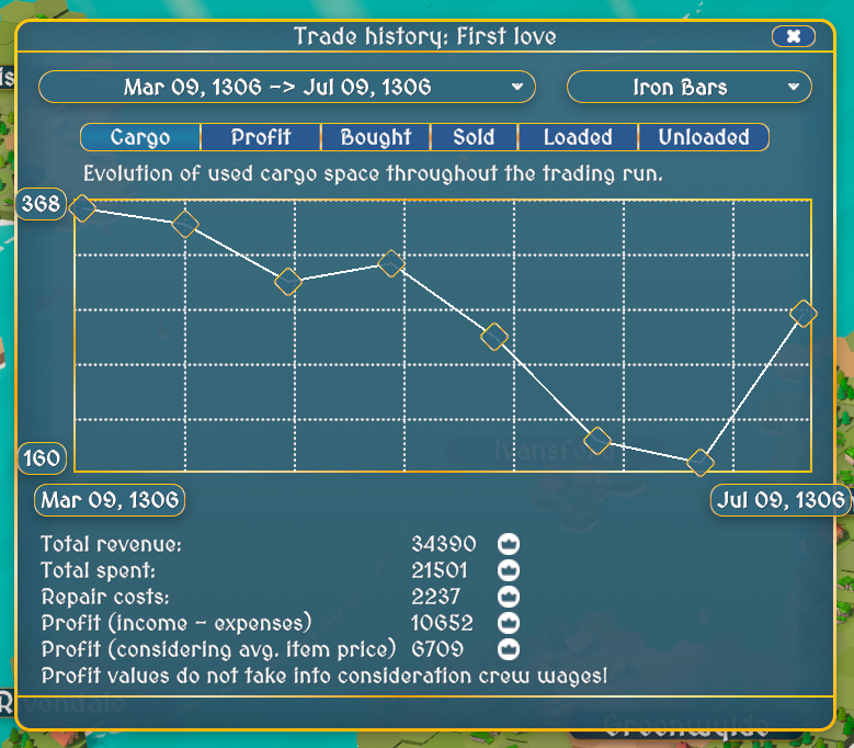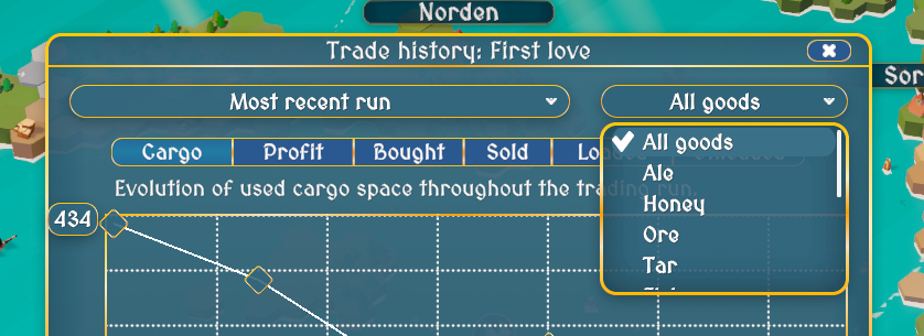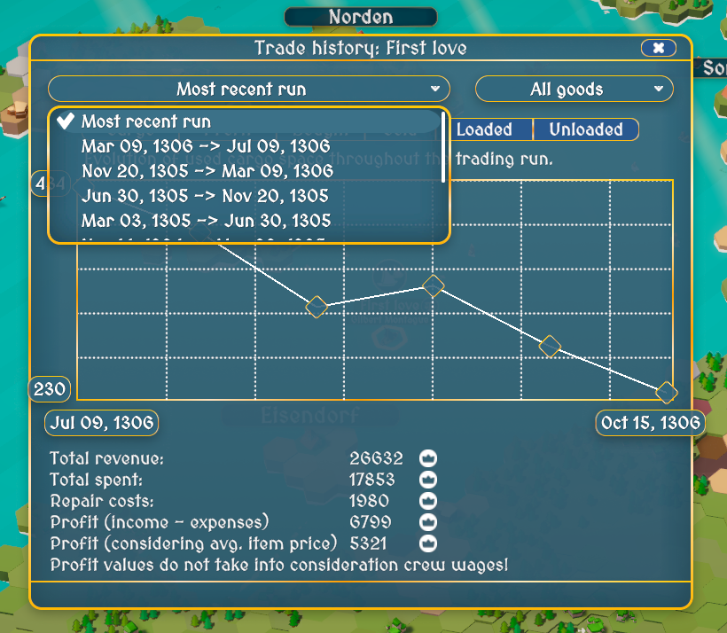 You can even filter your view to only include 1 single good! Moreover, you're only shown goods that have actually been traded in that run. This will help you debug your routes and ensure you buy/load exactly what you need and sell as much as possible, for the best prices!