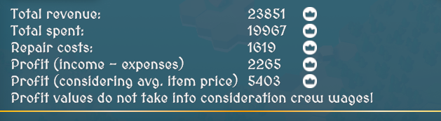 If you just look at all of our income and spending, that's the simplest way to consider profit! We sold stuff, bought more and then repaired our ships. Simple enough, right?