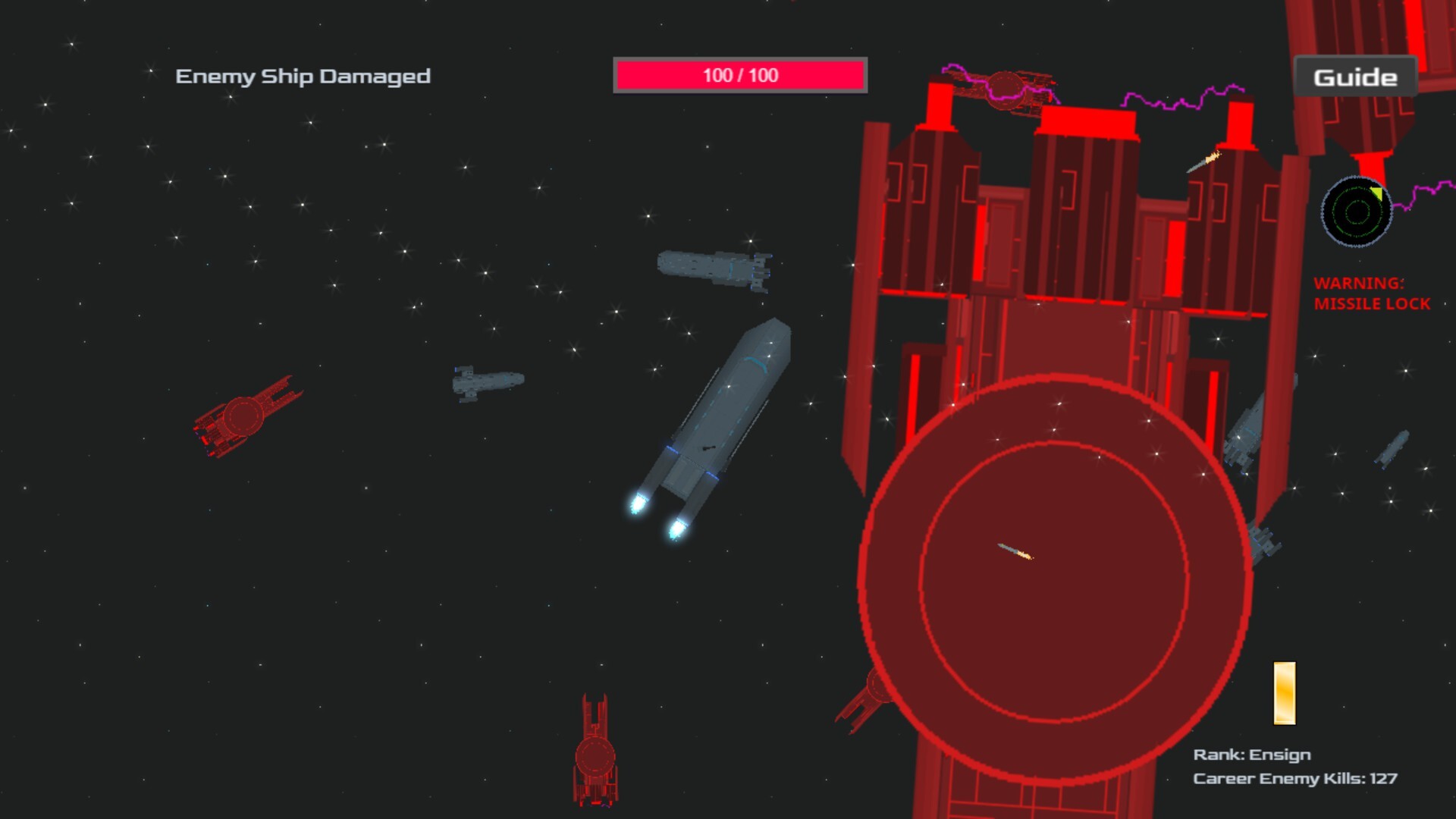 Enemy starships now look very different and much better. Where before they were simple flying saucers, they are now intimidating heavy cruisers with menacing electrical currents arcing around the engines. In the near future, I plan to add more enemy weapon types to keep players on their toes during ship-to-ship combat.