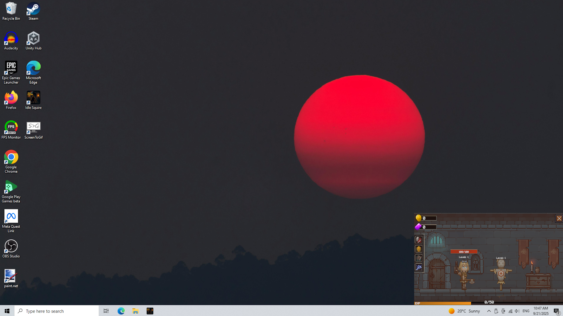 Here’s how Idle Squire looks running alongside a regular desktop. The squire trains, fights, and grows stronger quietly in the background, while you keep working, browsing, or gaming.