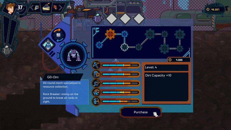 In Mining Merchant, you unlock mechs and companions. Every mech and companion has a set of unique stats and a unique ability, which gives each mech its own advantages. You can mix and match mechs and companions to create combos that best fit your playstyle or objective!