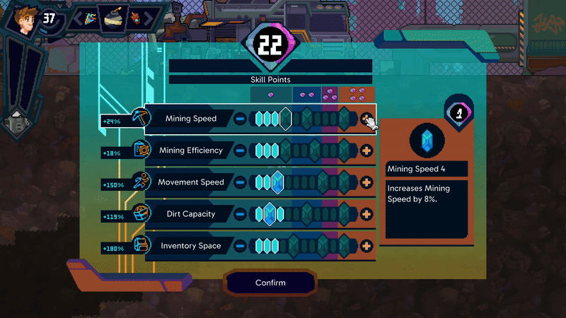 The main stat increases come from your character's stats. Characters earn exp with each tile and resource they mine. The rarer the resource, the more exp. Each level, your character gets a skill point which you can assign to a stat. These bonuses are applied on top of the base stats of any mech you enter!