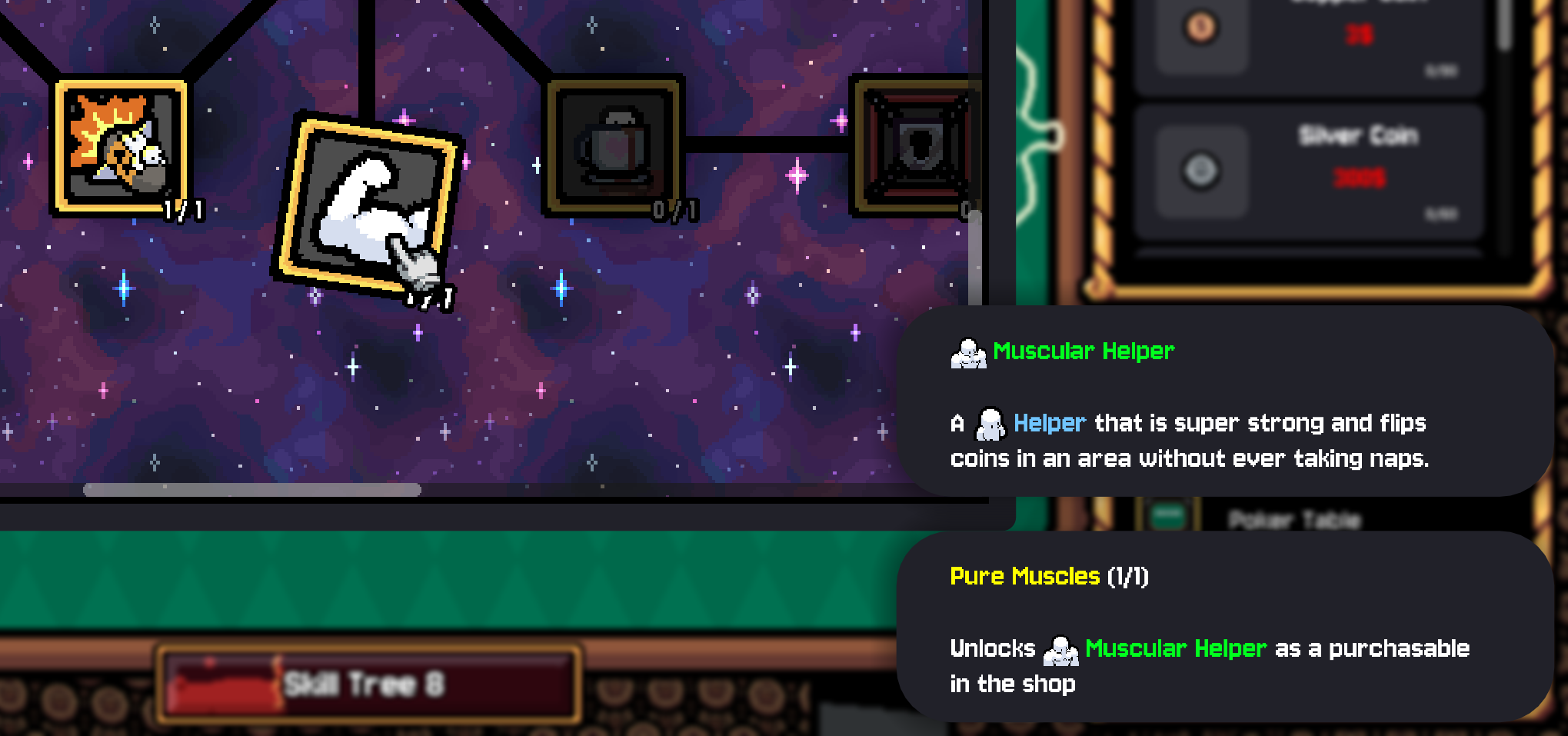 Tooltips now use icons whenever possible. In this screenshot we can see that "Muscular Helper" now gets a visual representation of what we can expect from that skill and purchasable.