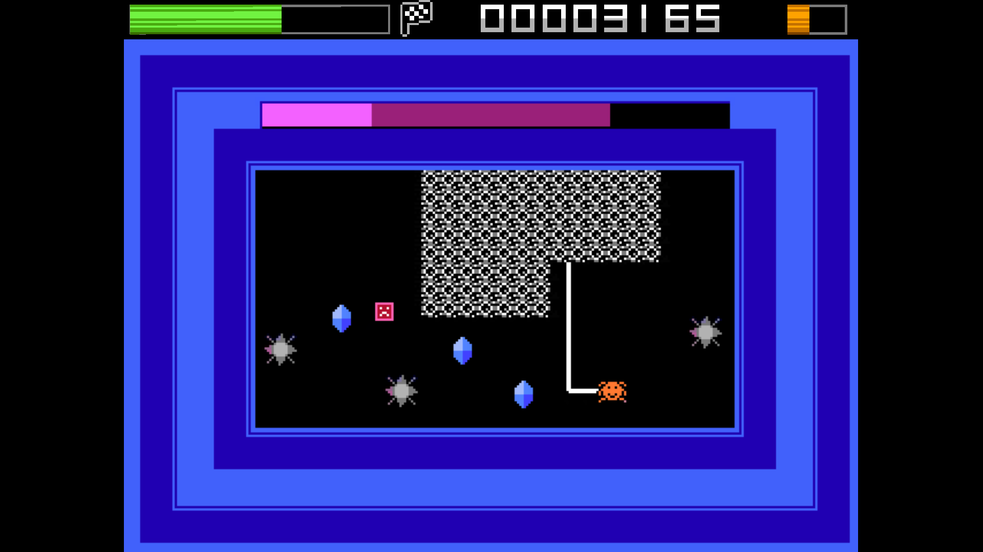 Another game approaches! 46th game called Fill Screen. It's a Qix clone, but it's faster paced and has additional elements such as collectables and spikes. Just in time for Halloween, you control a spider and fill up the screen with icky webs. Hold the button to create a line across without hitting an enemy to fill an area of the screen outside of the red enemy.