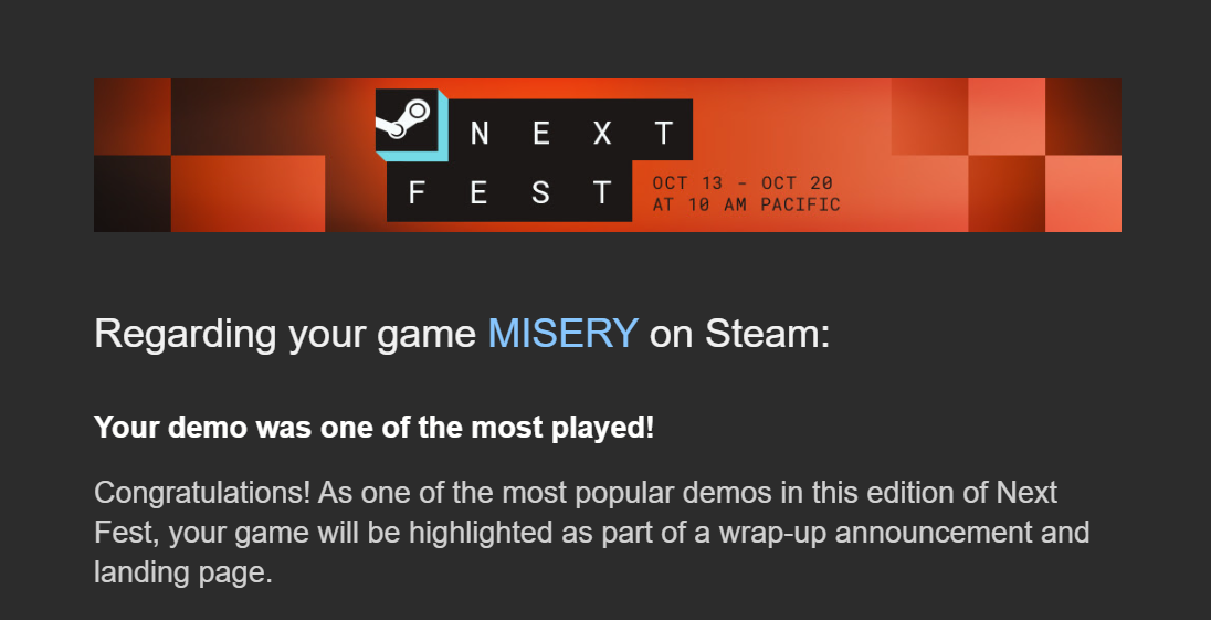We just received a message from Steam, saying that MISERY Demo did well and is a good demo.