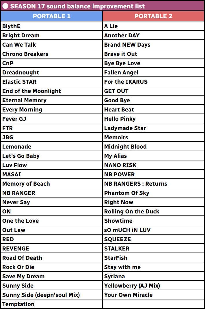 Sound balance improvements have been made for certain songs from PORTABLE 1 and PORTABLE 2. The affected songs are as follows.