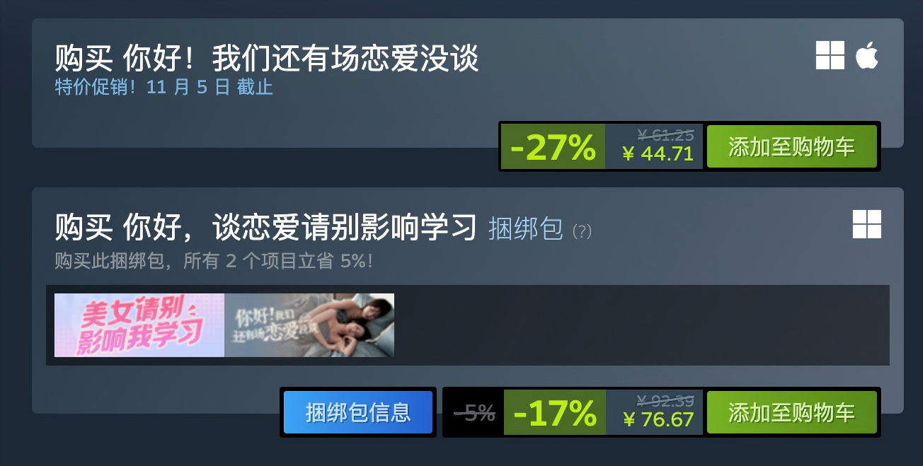 10月22日至11月4日节日期间,《你好!我们还有场恋爱没谈》Steam平台 -27% 限时折扣!