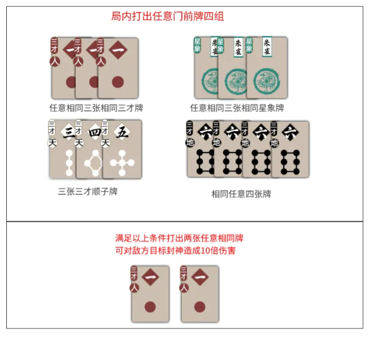 If the number of card groups in front of you reaches 4, you can play 2 identical cards and consume all card groups in front of you during your card-playing phase, dealing 10x your Attack value as damage. Note that Multiplier Attacks will take up the number of card plays for Sancai Cards/Xingxiang Cards in the turn.
