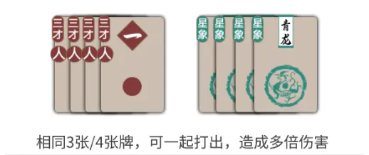 If you have 3/4 identical cards in your hand, you can play them together to deal 2x/3x your Attack value as damage, and you will also get an additional Magical Artifact upgrade.