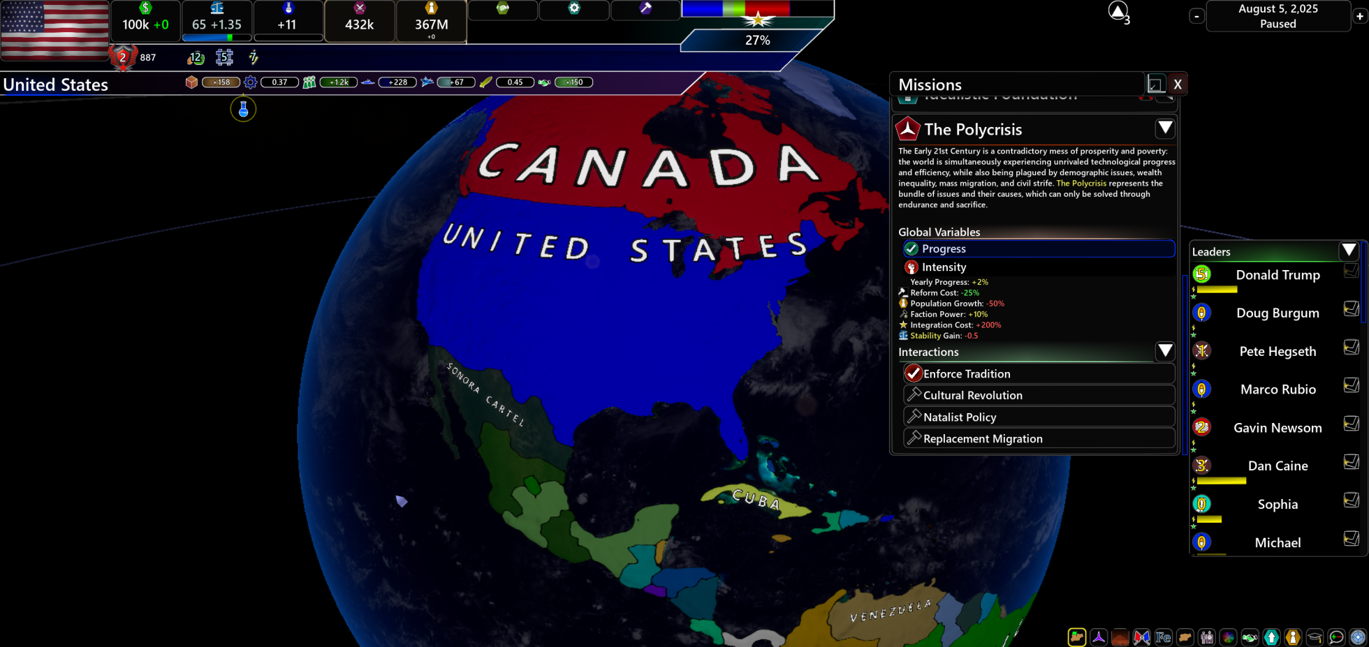 I have more or less finished the 2025 scenario, but it may not be balanced properly so keep that in mind when playing. 2025 differs from 2092 in quite a few ways, the most important being the Polycrisis Situation that most countries have, as well as a much more polarized level of development/education across the world.