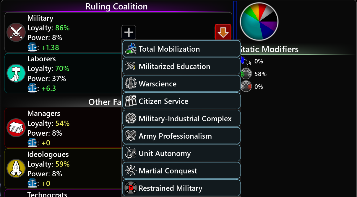 Faction Privileges now have their own icons, which are color coded to the faction they belong to. In addition, Factions' desire for reforms have been slightly altered, making them more interested in reforms that they should like, and there is a larger penalty for going against your Factions' wishes.