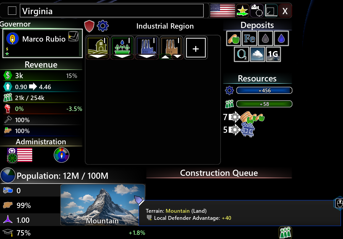 Regional Faction control is now determined by many more factors, and no longer has seemingly random oscillations. It is now significantly harder to monopolize the politics of your entire country to a single faction, but it is also more rewarding to do so.