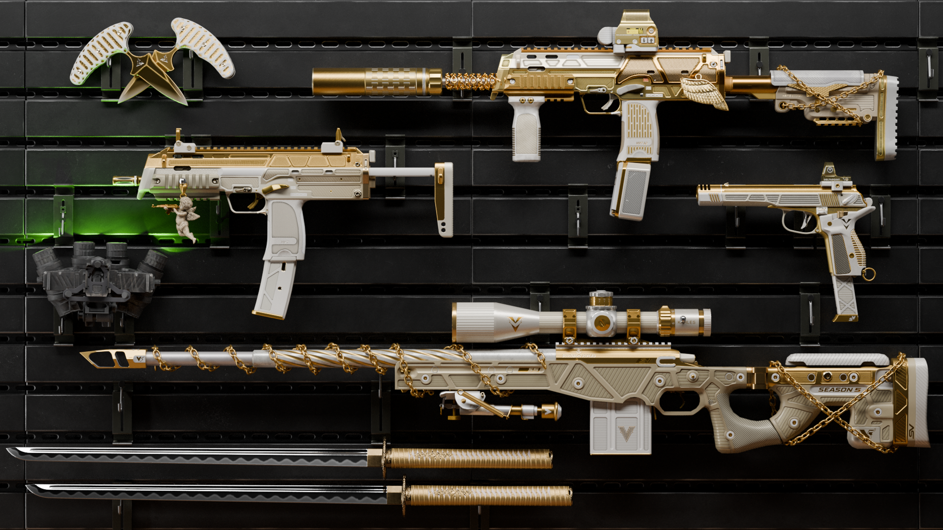 Enter Combat Master Season 5 and unleash the ultimate collection of precision firepower. Command the battlefield with gold-forged assault rifles, the iconic MP7, and the sleek Makarov Pistol -- each engineered for tactical dominance. Paired with angelic charms and elite operator gear, these weapons redefine perfection. Shine bright. Strike fast. Own the fight.
