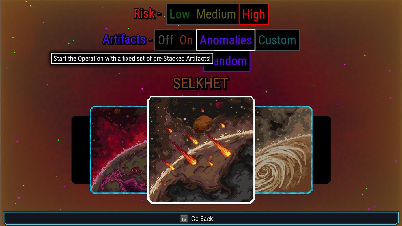 [/carousel]As you can see right above, Artifact Anomalies are essentially a fixed set of modifiers, or rather Artifacts that will be unchangeable during your whole Operation... Survive long enough, and then cash in for a big reward! Think of it as a "challenge mode", but with a different name because flavour (and it sounds cooler). Official Anomalies, for instance, will always give bigger rewards, so that I can very flexibly add in the vast majority of your suggestions as they are without compromising balance ;)