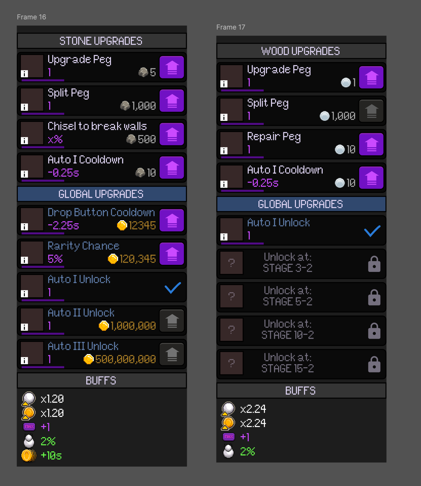 So, in this mockup you can see how the buttons might look for Stone, if everything was unlocked, and things are starting to get expensive because it's late game. On the right is an example of early game, the Wood stage, when things are still early/locked. You can see how the unique stage currency (balls) can be used to invest in stage-related upgrades.