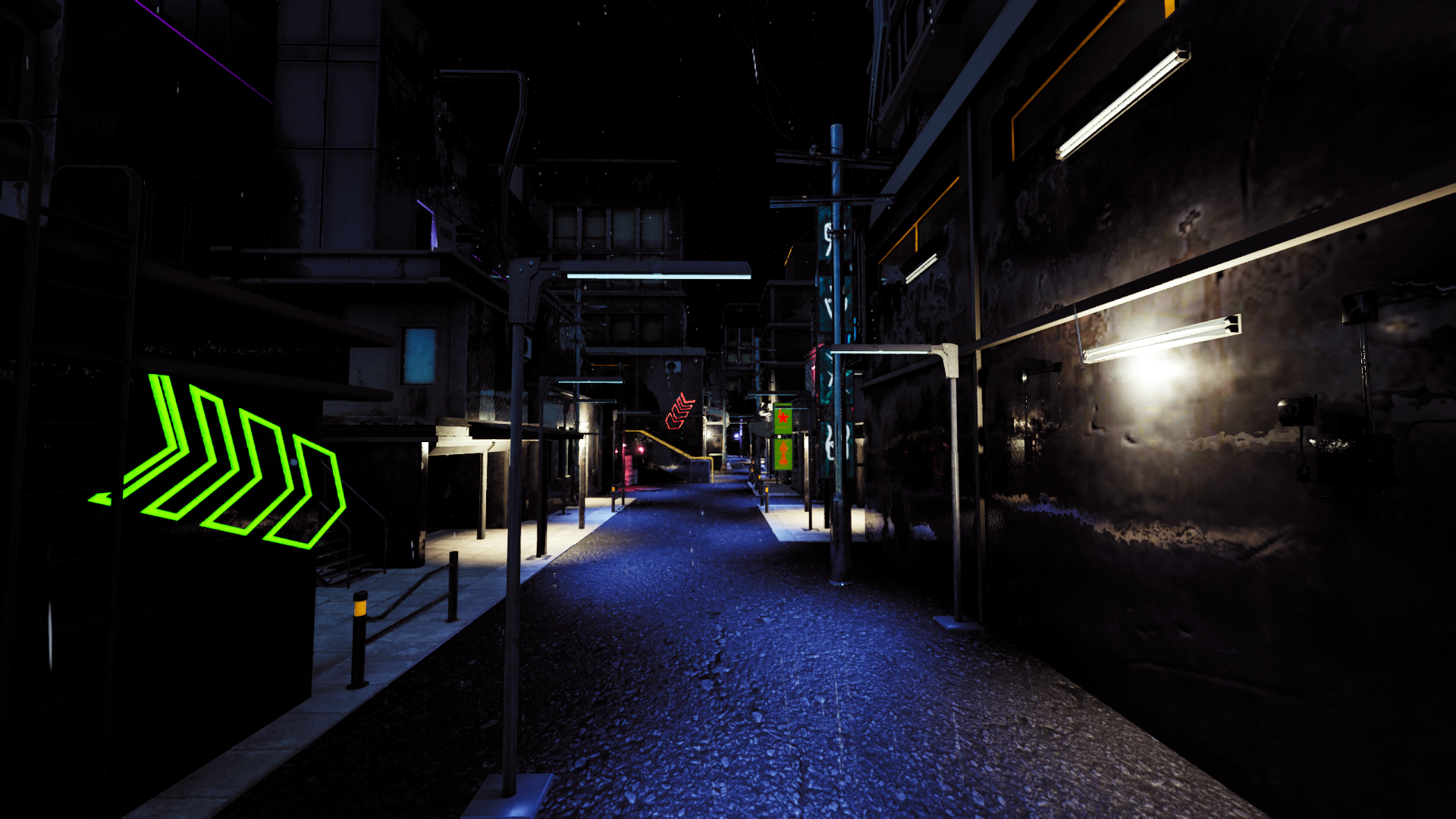 Game Designer Street is a cyberpunk-style neighborhood. Neon signs, reflections, and lighting. Game designers can change some of the game's rules. They can teleport you and disable certain features.