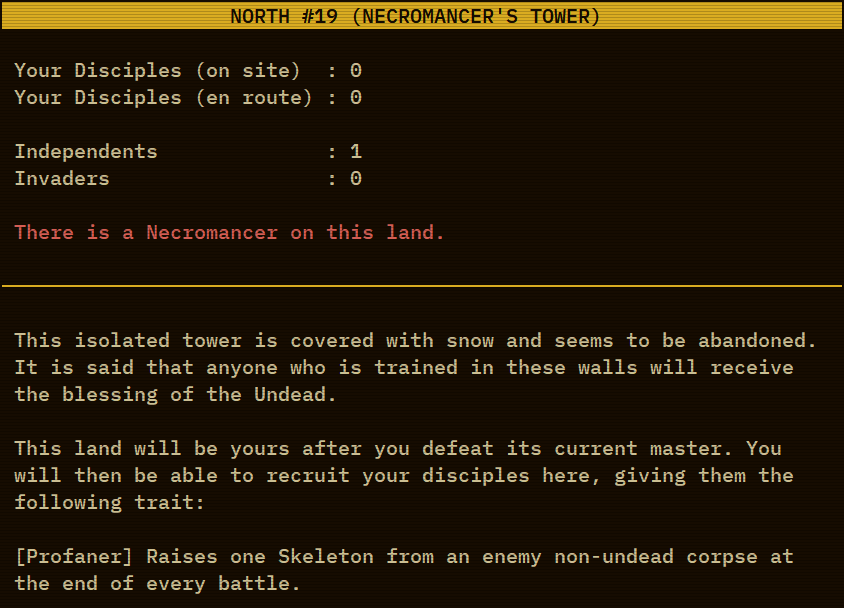 Speaking of traits, I've completely changed how the "trait giver" landmarks work, like the Necromancer's Tower or the Banshee's Pool. Before, you had to kill the owner and then send a disciple to meditate there in order for them to gain a new trait. Now, you can conquer the place by killing its owner, and all the disciples you'll recruit at this landmark will receive the local trait. Creatures in those places don't respawn anymore.