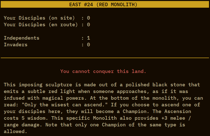 Prior to 3.0, landmarks didn't have much impact, and most of them could just have been random Points of Interest (POI) or special events. I tried to give a purpose to all of them so that you would have a real interest in moving one of your disciples to a landmark. Now you will ask yourself: "Is the new trait valuable enough for me to recruit a disciple there on this land, potentially very far from my main base?"