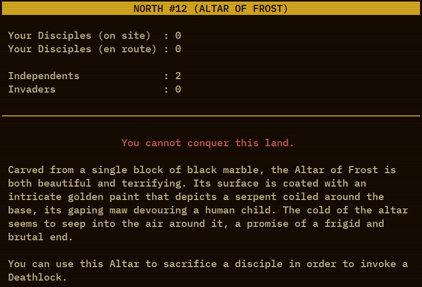 Another big change concerns the Altars. Before, they were mainly used to gain new essences. The problem with that approach was that this landmark occupied a land for no obvious reason. There was no reason for the player to move their disciples on this land, and the strategic value of this landmark was therefore non-existent. Now, in 3.0, Altars are used to summon new units! All those units have one of the following traits: \[Construct], \[Magic], \[Demon], or \[Undead], and there are a lot of new traits interacting with them.