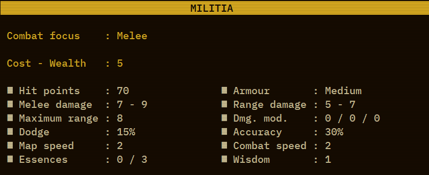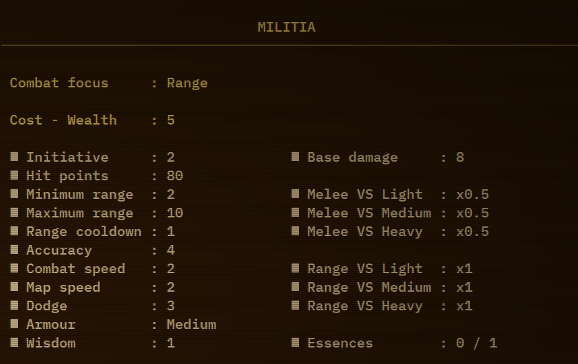 As you can see, things are even simpler than before! Initiative is gone (faster units play first), as well as minimum range and range cooldown. There are now two base damage types: melee and range, and they both have a range of min/max values instead of being a fixed value.