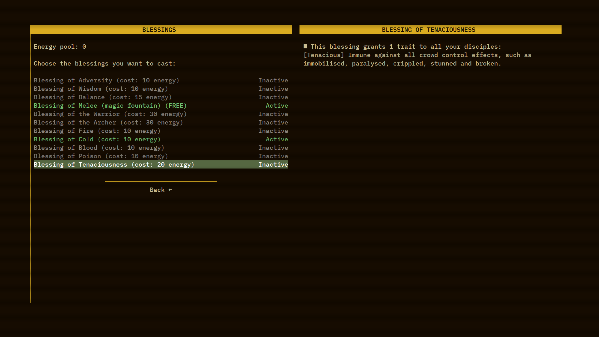 All disciples have been revised. Their stats have been rebalanced, and new traits have been added. I've added 36 new traits in total, and many different ways to acquire them. Traits have been one of the main focuses of this update: enemies have more of them, Champions have default ones, and Blessings can grant you temporary traits as well (more on that below). Note that the trait limitation per disciple has been completely removed.