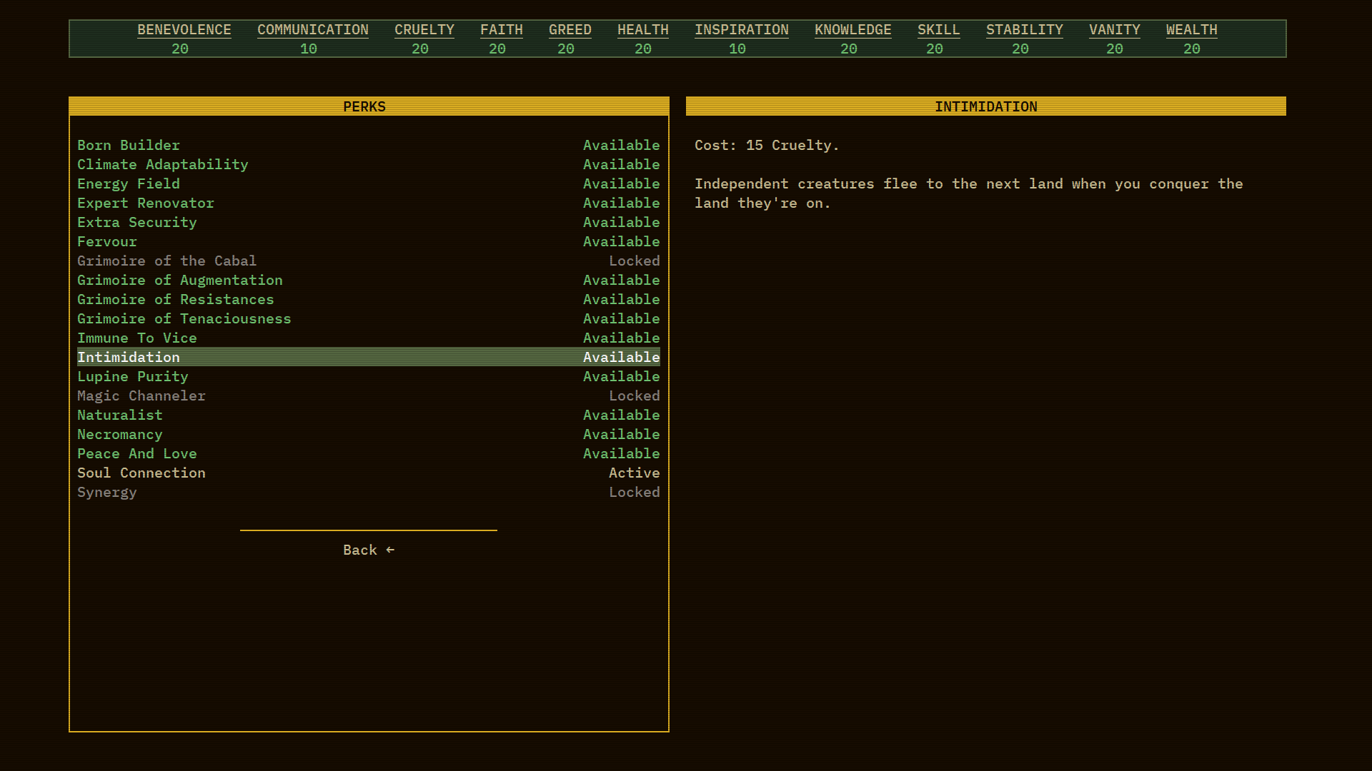 The previous perk system was tedious and confusing. Now, perks are what you would expect from any game: a bonus that you can unlock in exchange for resources. I've added and altered many perks, and also implemented new game mechanics to interact with them. For instance, the Independents (who are kind of a new faction) can "sneak attack" your bases at night if you don't defend them properly... or you unlock the Intimidation perk: