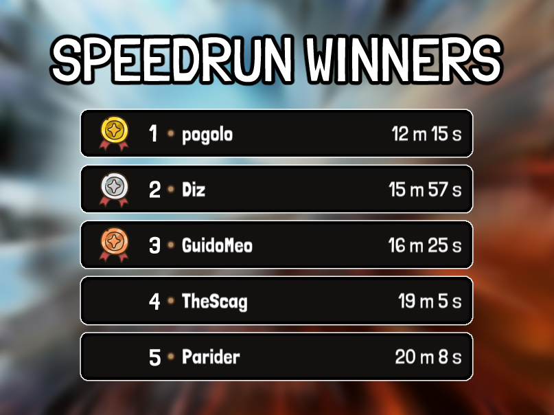 Congrats to Pogolo for being the fastest at beating the demo (for now!) and to all other players. We'll be contacting the five speedrun winners in our Discord, and we'll add the 10 giveaway winners on Steam to send them the key.