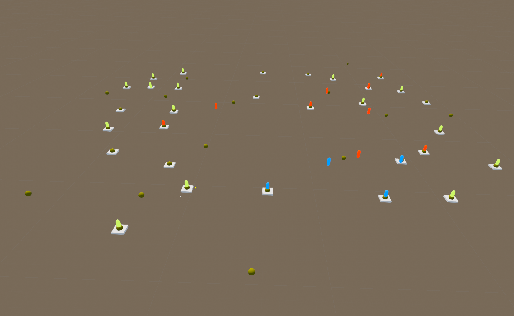What you are looking at is a graphical representation of an "ecosystem" in a large map like West Petrovsky running in real time. Each square represents a base - for both humans and mutants; each yellow dot represents a navigation waypoint, and they sometimes overlap with the bases. The capsules are "squads" - groups of NPCs, both humans and mutants, who are either occupying a base, or out and about on expeditions.
