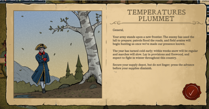 Popup notifications are finally finished being drawn and colored. There are now unique images for every type of popup including âWar is Upon Us,â âTemperatures Plummet,â etc. We also fixed the âScorched Earthâ image which was cut up and bugged out.