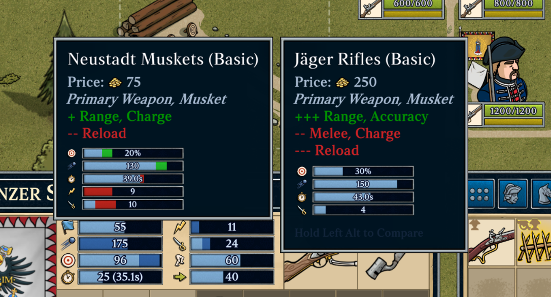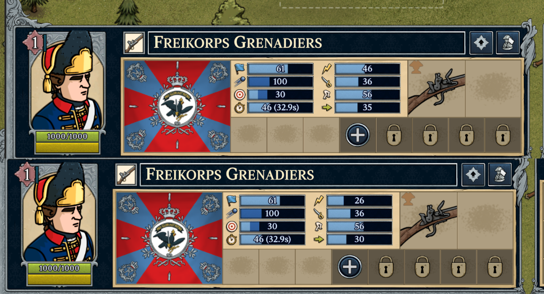 Fixed a UI bug where your stats werenât displaying correctly when you upgraded a unit. Notice in the bottom image the Freikorps Grenadier is displaying as 26 charge damage despite having 46.