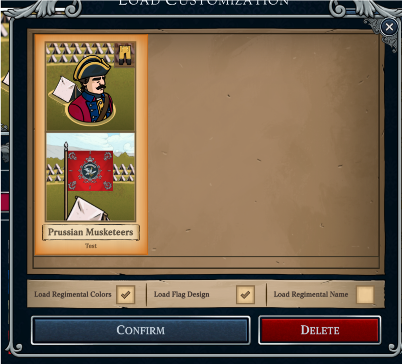 The next exciting update about customization is that you can save and load your creations. They also get placed into an easily accessible folder so you can share units with friends. When you load a unit, you can also choose if you only want to load the flag, or the uniform, or just the name of the unit.