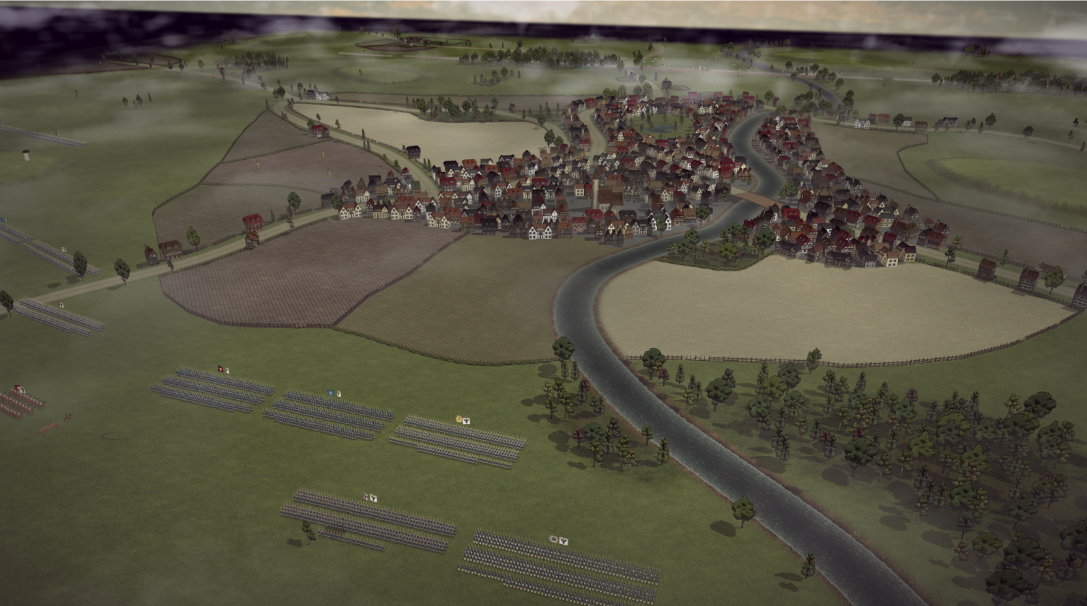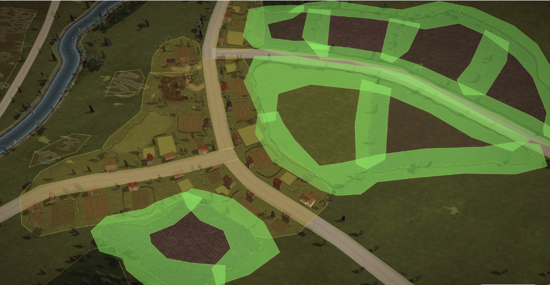 All cover zones have been expanded to be easier to utilize. Instead of needing to fit a regiment in a specific block of houses, you now get the cover of the buildings for just being in their general radius. Hedge cover has also been expanded to feel more consistent. Green zones in the picture below are hedge cover, yellow is for the town.