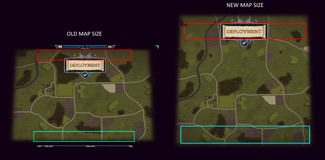 Deployment zones are now much larger for all scales. I also loaded into all of the possible spawn positions to make sure there were not cases where your troops are deploying so far back that the camera is in the fog like in the screenshot below. All of the aforementioned changes have been made to make the player feel less claustrophobic and pressured to fight in the map corners/edges. You should now have enough pressure relieved in order to properly take up good positions on the map before the enemy engages you.