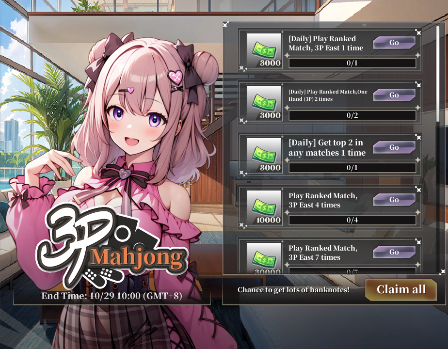 Enter the Ranked Match and play Three-Player Mahjong to earn tons of Cash and Green Gifts!