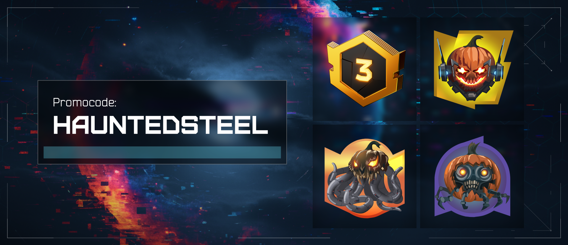 Activate the promo code HAUNTEDSTEEL to claim your Halloween arsenal: 3-Day Premium Account, Nanite Nightmare Sticker, Tentacular Jack Sticker, Pumpkin Pilot Sticker.