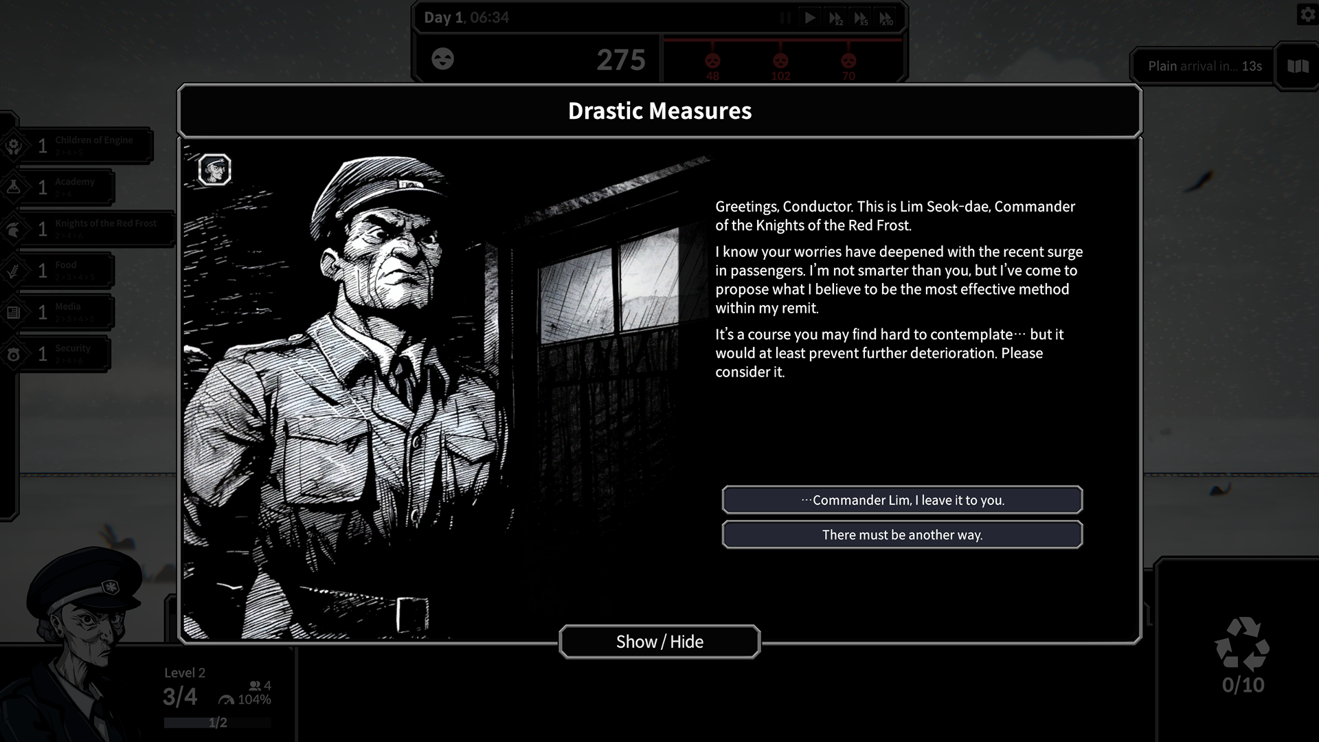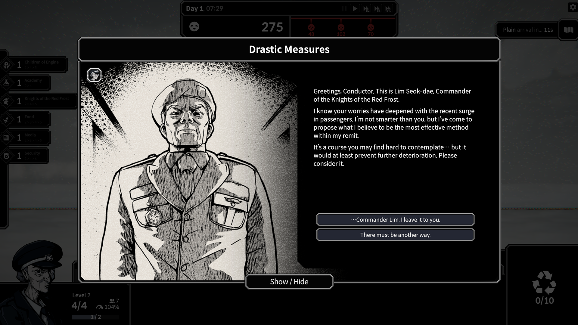 Oh—and one more thing! In the demo, the playable character Choi Soon-ja features her own exclusive scenario. It’s designed more like a campaign, so the Shanty Carriages will not appear in Im Seok-dae or Jo Mimi’s scenarios as they do now. So, don’t worry— if you’ve thought, “Even with two extra train cars, Soon-ja’s train feels cramped—what about the others?”, rest assured—each character will have their own unique story events and decision sets.