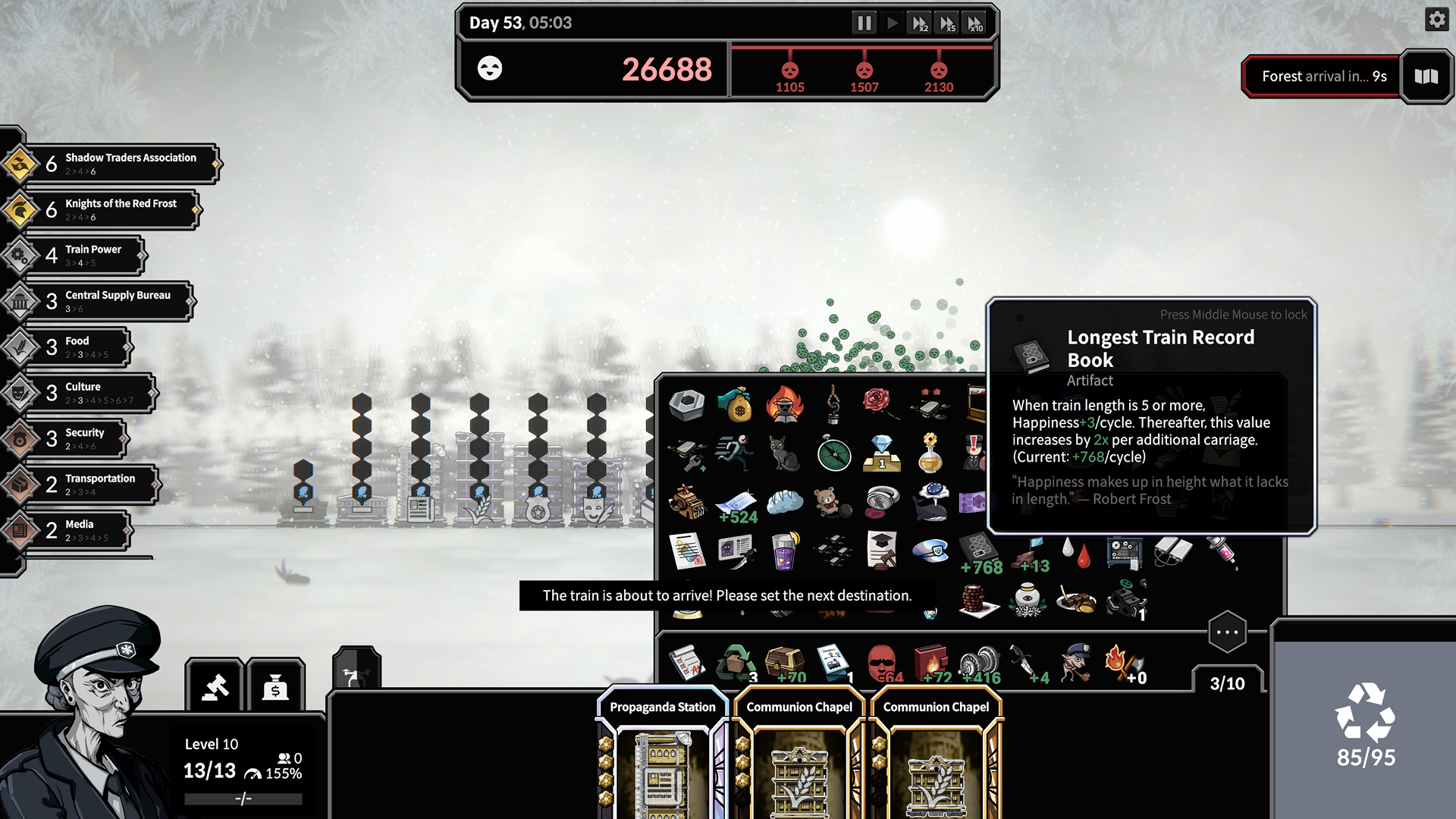 So, what’s the most notable difference between Frostrain 2 and its predecessor? The answer is Artifacts. Artifacts are powerful items that greatly enhance your train—and while playing the demo, I’ve often found myself in the following situation: