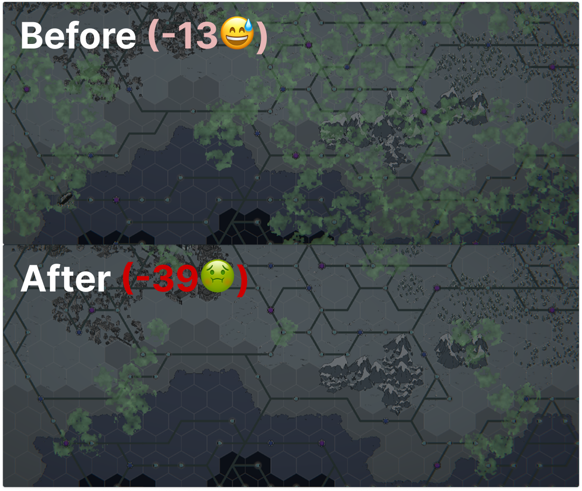 Now, what’s the biggest difference between the images above and below? Yes—the number of Contaminated Zones has been significantly reduced. If you can avoid them, you should. But sometimes, what lies beyond the contamination is too valuable to ignore—and so, you must decide whether to break through or bypass the danger. Previously, the zones were too vast, making meaningful decisions impossible and reducing their overall significance. We’ve now reduced their number but increased their intensity, encouraging more deliberate route planning.