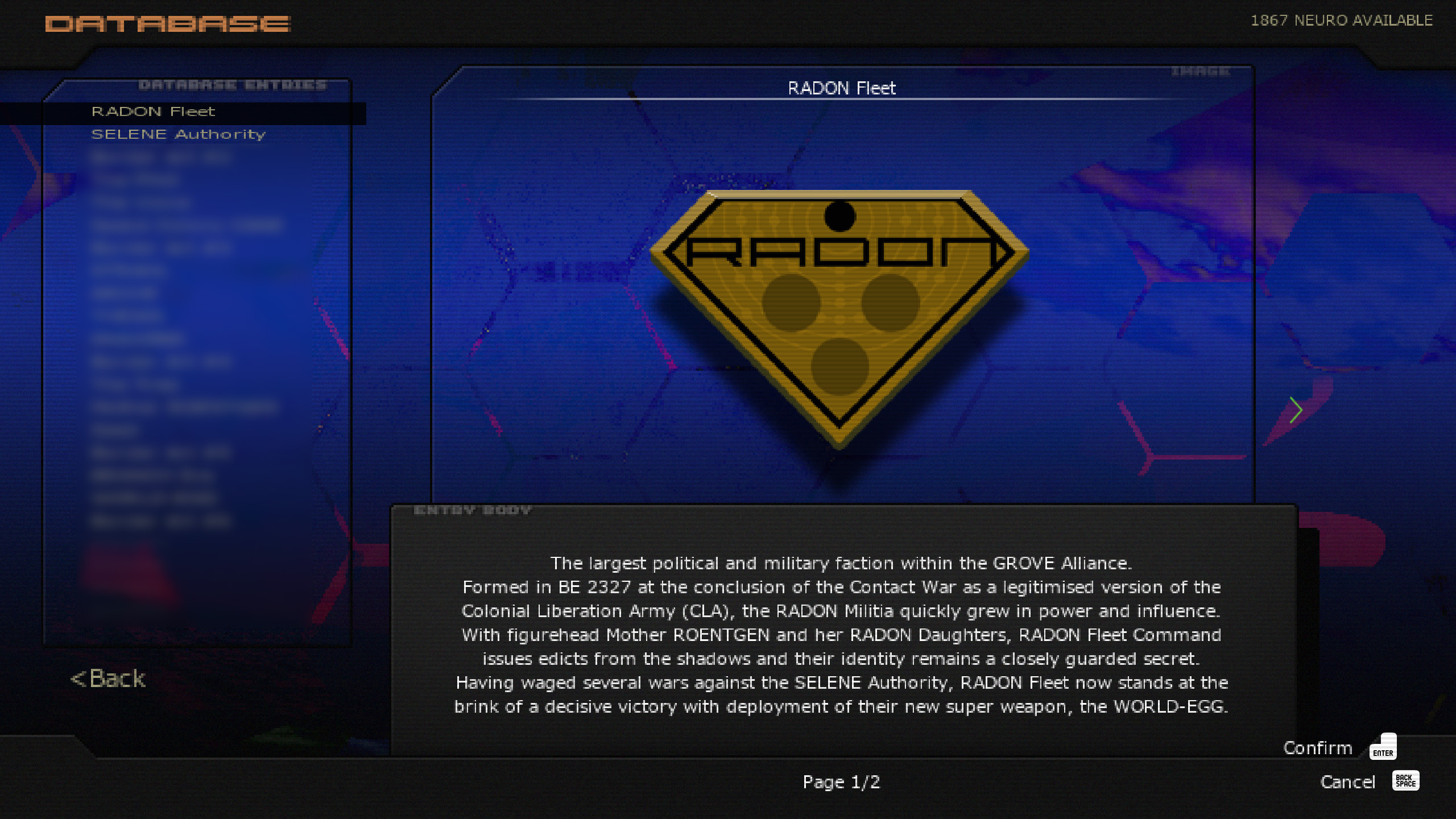 Much of the game’s back story, as well as information about the characters and their ships are available in the game’s database, the DRYAD MEMORY. By playing BIRDCAGE, the player earns an in-game currency called NEURO. NEURO can be spent within the DRYAD MEMORY to unlock the aforementioned additional story information, as well as new window borders, to customize your gameplay experience!