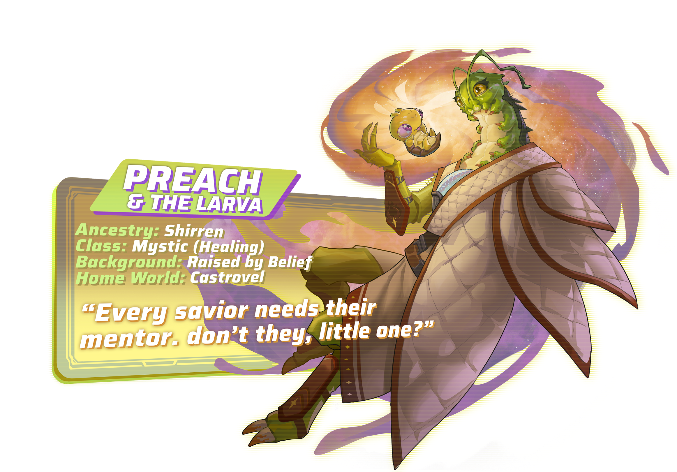 Preach is a Shirren (Class: Mystic), devoted to mentoring and protecting the Golden One: a prophesied larva miracle of Hylax that accompanies this adventure. Neil will infuse this sage with a distinctive personality, following the journey toward becoming a famous High Priest. Of course, whether (or how) this destiny is fulfilled will depend entirely on your choices and how you handle the challenges of the galaxy.
