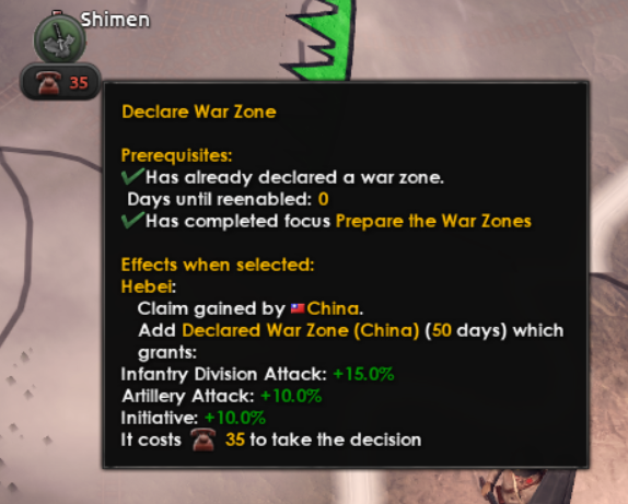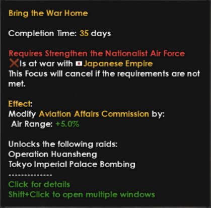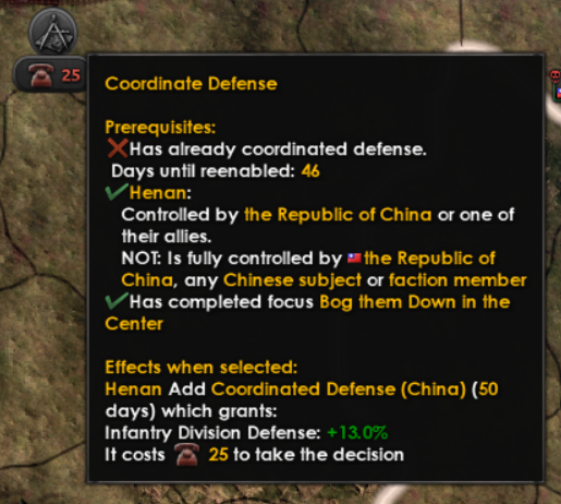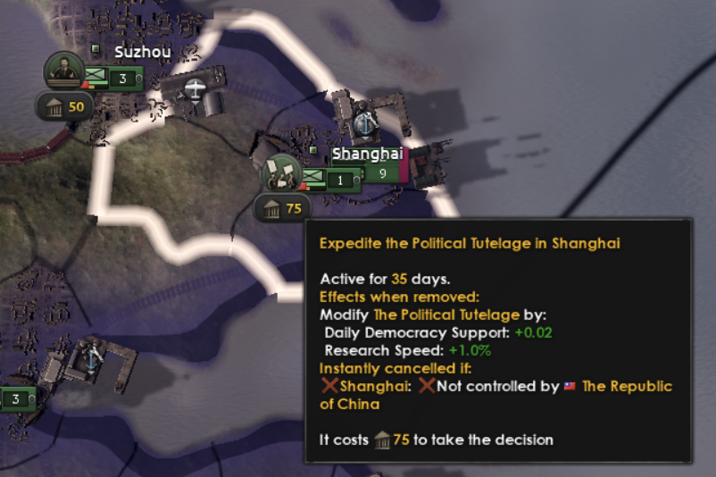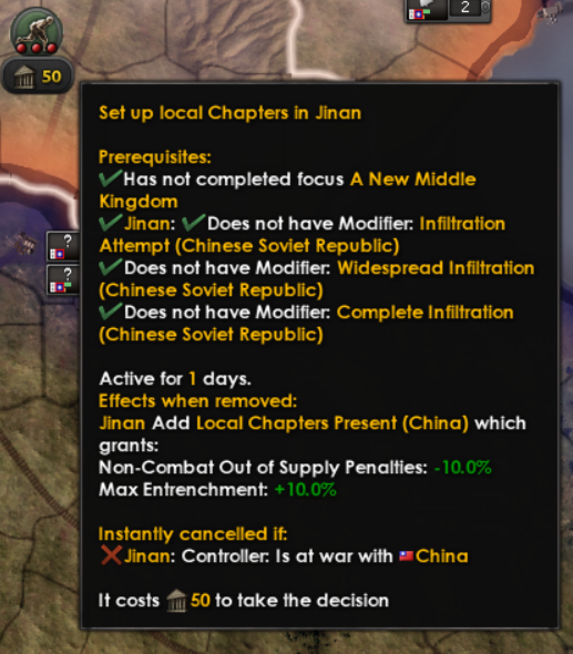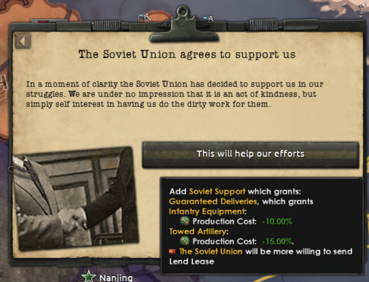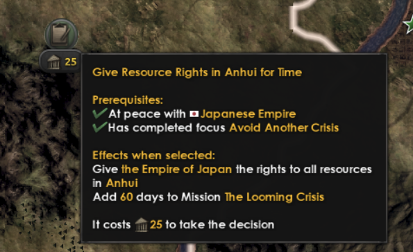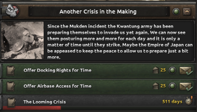 We have previously given you the option to hand over northern China to postpone the war, but we’ve wanted to expand on that to give you more gradual control. Thus you now will be shown how many days until the Kwantung Army says that your sovereignty is overrated which can be influenced by placating the Japanese with concessions. This gives you valuable time to build up your defences, but remember that anything you give the Japanese won’t be usable by you and they will come after you at some point.