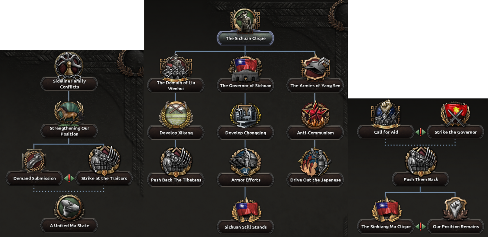 As examples of new sub branches, the Ma Cliques share a subbranch about unifying into one country, while the Sichuan Clique has a subbranch representing the divided administrations and nature of the province at the time, and the Khotan Ma Clique has a subbranch about attempting to unify Sinkiang province under their rule.