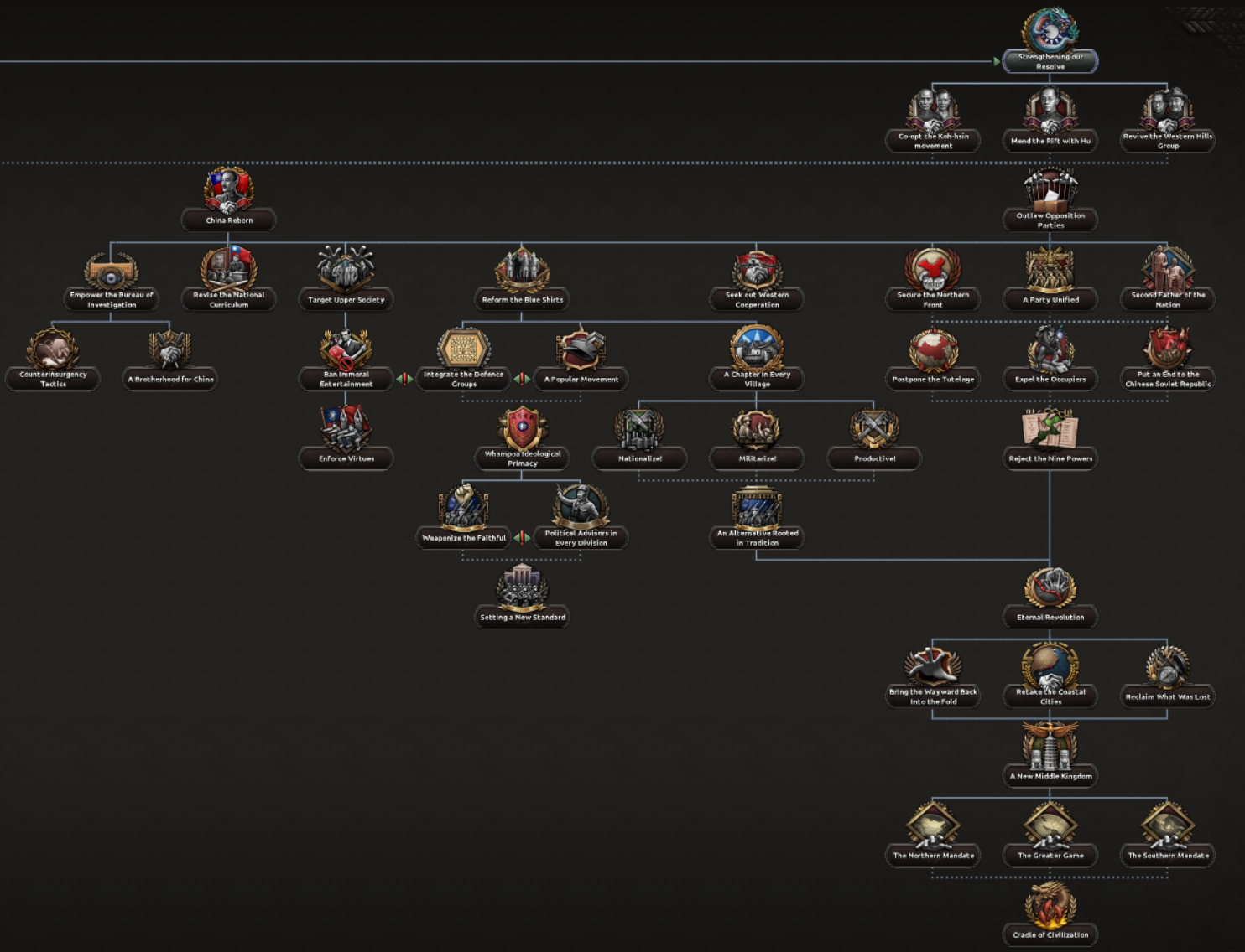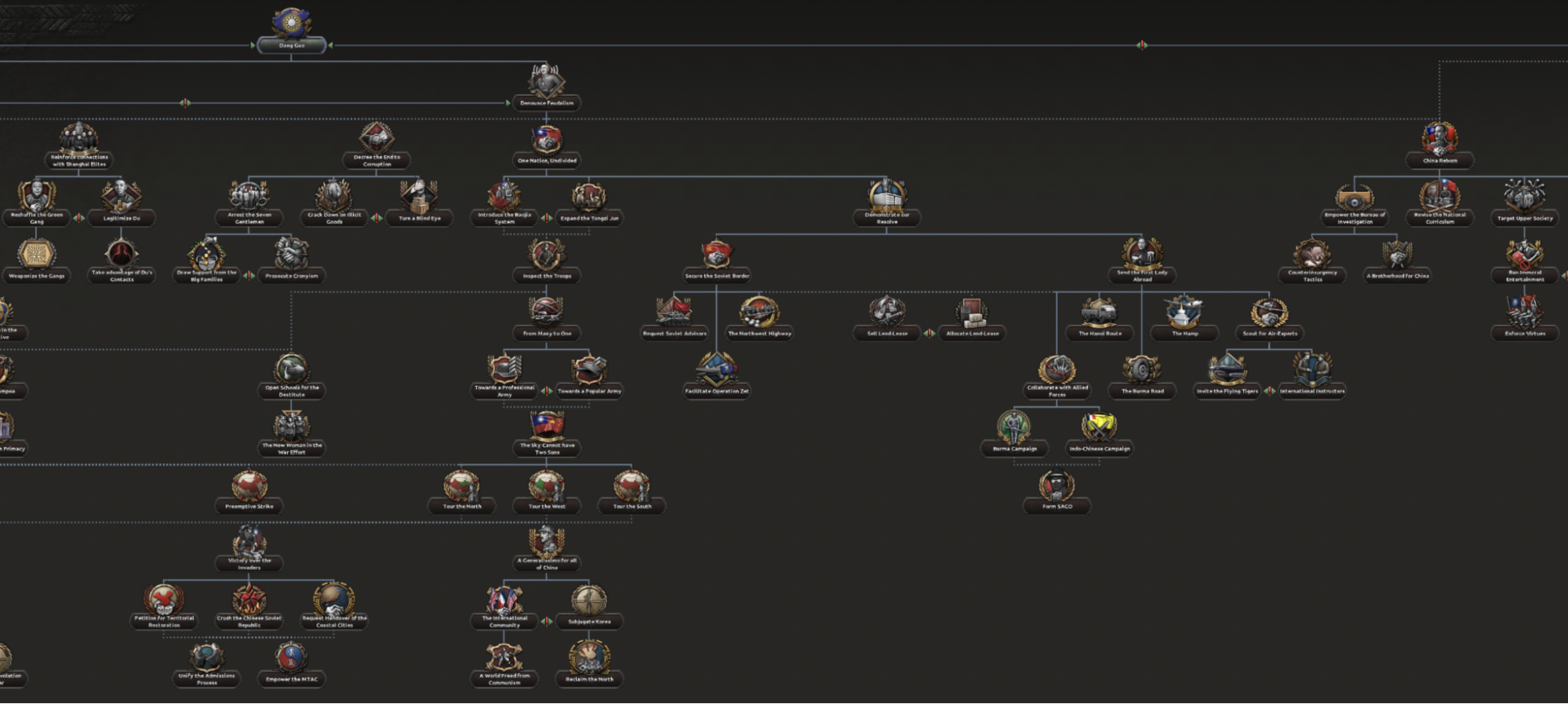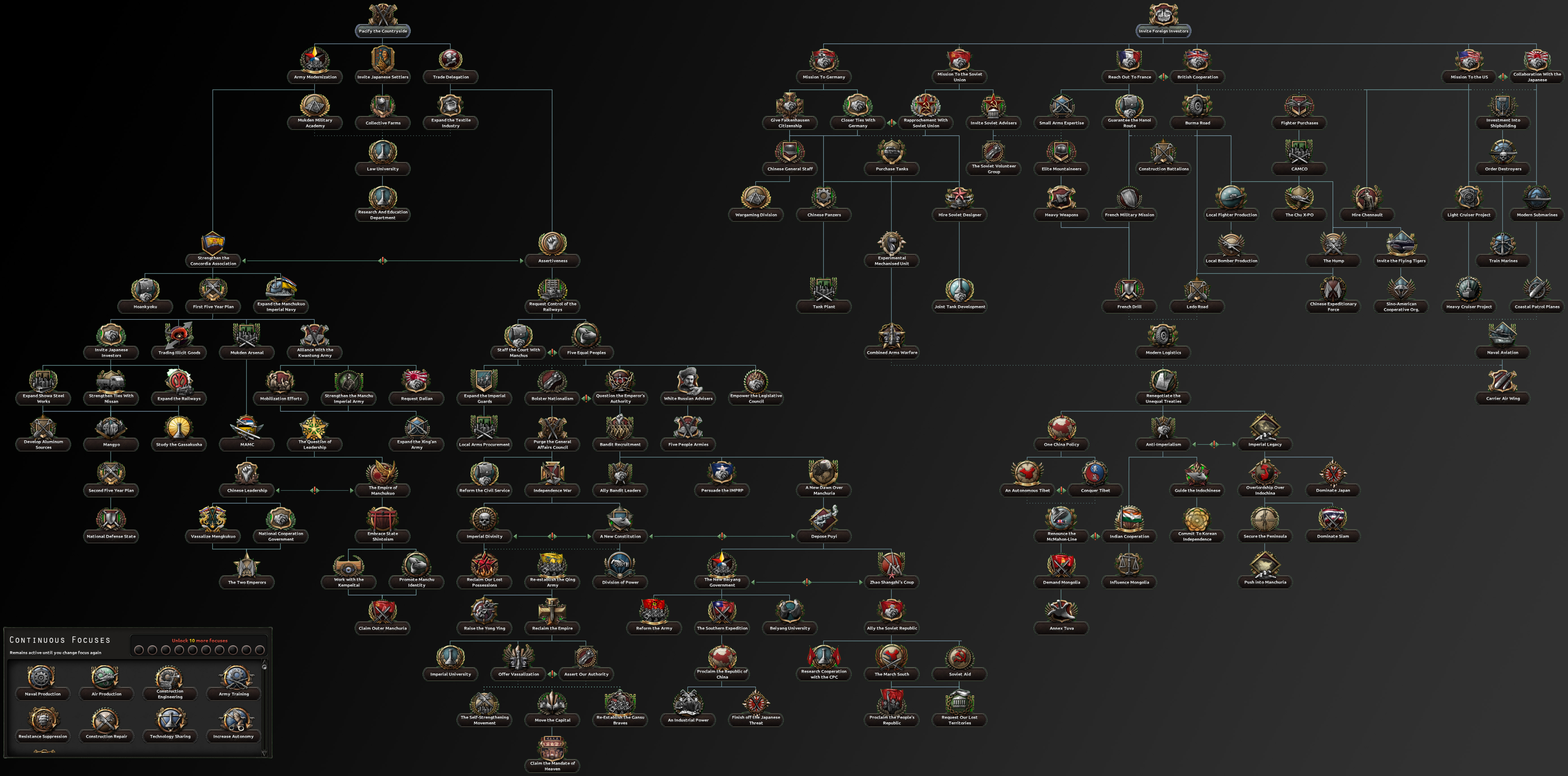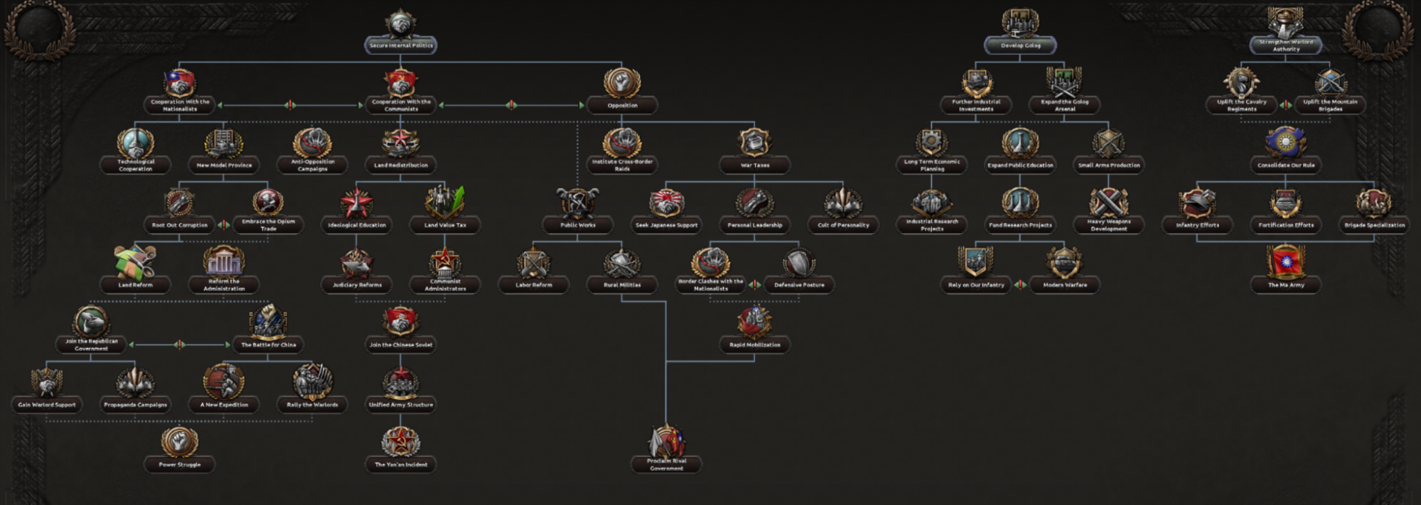 At the head of the Chinese central government is the Kuomintang, the party founded by Sun Yat-sen two decades prior and the only fully legal one of the period. In 1936 it is governed by Chiang Kai-shek, the Generalissimo, but that doesn’t mean that there aren’t opposing voices and opinions within the party. This means the nationalist focus tree is to a large degree a Kuomintang focus tree where the different paths are different groups within the party and some of the parts overlap.