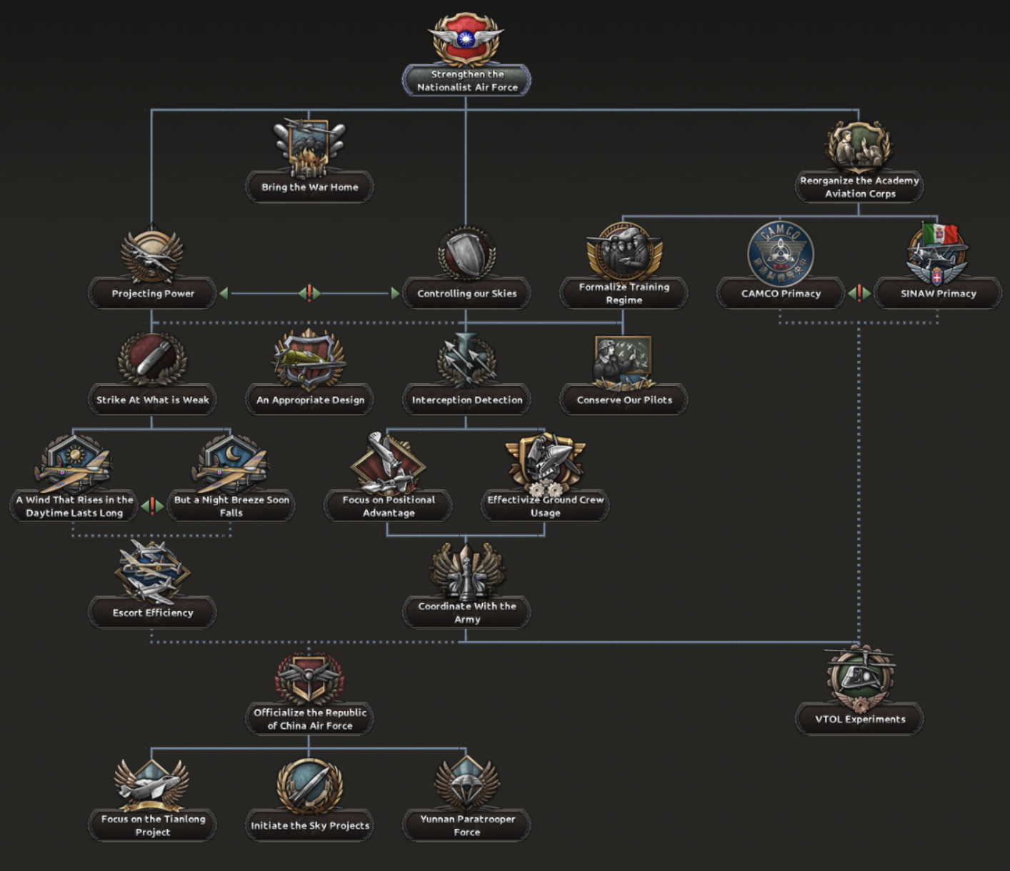 You will of course also have options of which organisation should manufacture your planes either going with the Central Aircraft Manufacturing Company, CAMCO, with their focus on high-powered interceptors, or the Sino-Italian National Aircraft Works, SINAW, specialising in medium sized bomber aircraft.