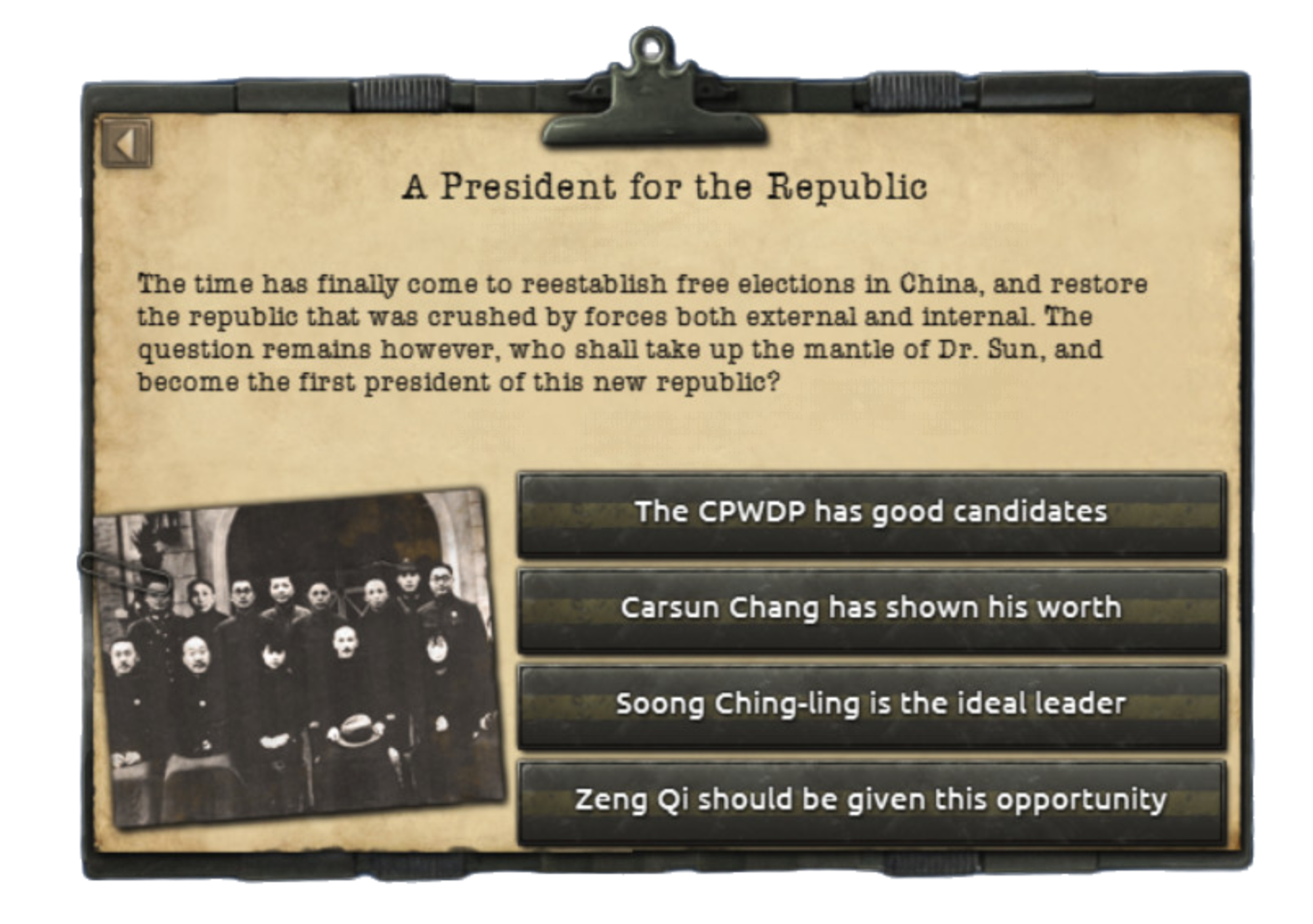 As your project of spreading democratic ideals throughout a large country will take time you will need to find a way to resist the foreign invaders. As many Chinese had left the country prior to the timeframe we’re looking at, you will be able to draw support from different places throughout the world.