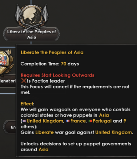 Standing together against aggression will open up the possibility to bring the glow of liberty further throughout Asia and Oceania. By awakening the peoples yearning for freedom you will stand behind the independence of all colonized. Even if this brings you into conflict with the empires of old you will create a properly democratic alternative to the Allies.